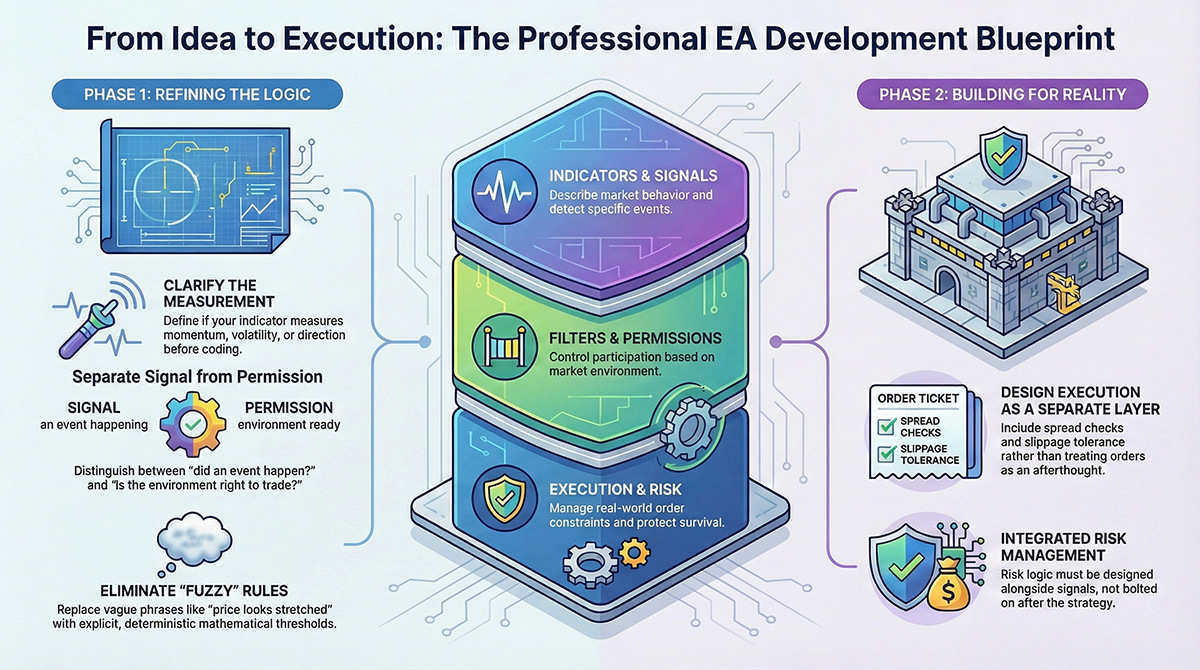 Learn the real EA development process from indicator idea to live MT5 execution. A practical guide covering indicator logic, signal generation, risk handling, and order execution for building robust Expert Advisors.