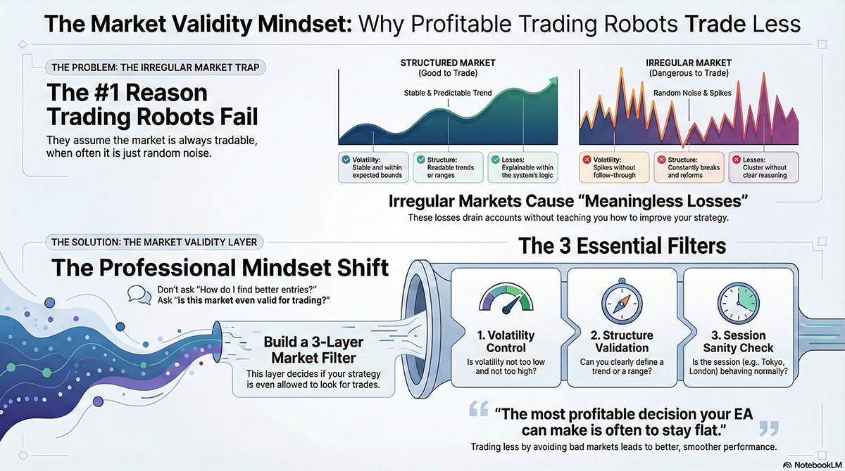 Most Forex EAs fail not because of bad strategies, but because they trade during irregular market conditions. Learn how professional system traders detect untradable markets using volatility, structure, and session behavior filters.