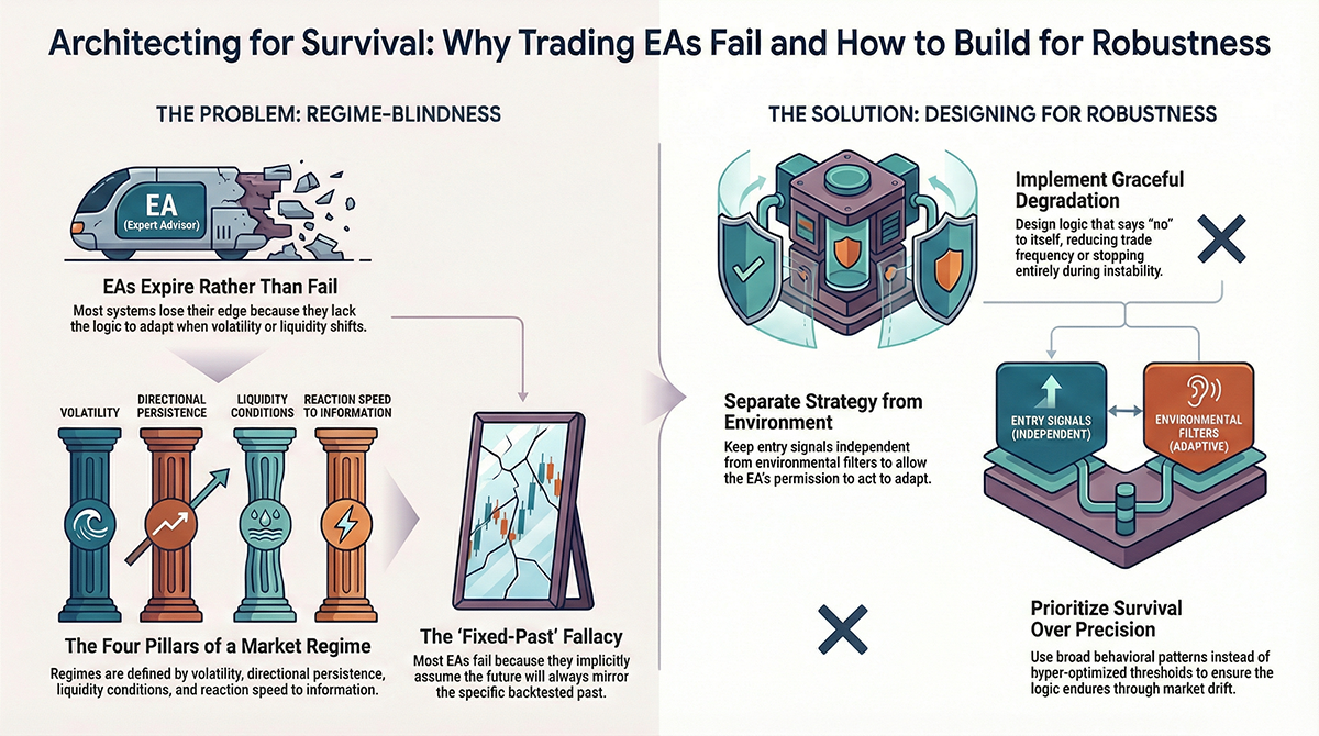 Markets change faster than most EAs. Learn how to design EA trading logic that survives market regime changes using adaptive structure, regime filters, and robustness-first thinking instead of brittle optimization.