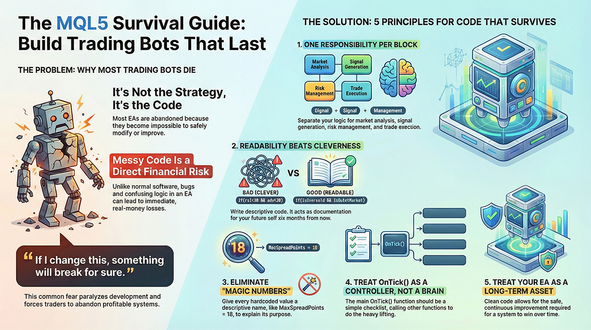 Learn how professional EA developers write clean, maintainable MQL5 code that survives years of refactoring, optimization, and live trading. Practical patterns, real EA examples, and refactoring mindset for serious algo traders.