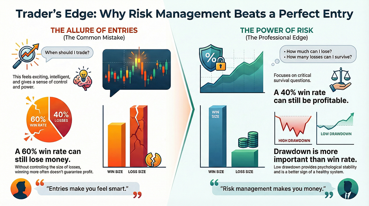 Learn why trading risk management beats perfect entries. Practical guidance for EA traders on position sizing, drawdown control, and risk vs reward to achieve consistent performance.