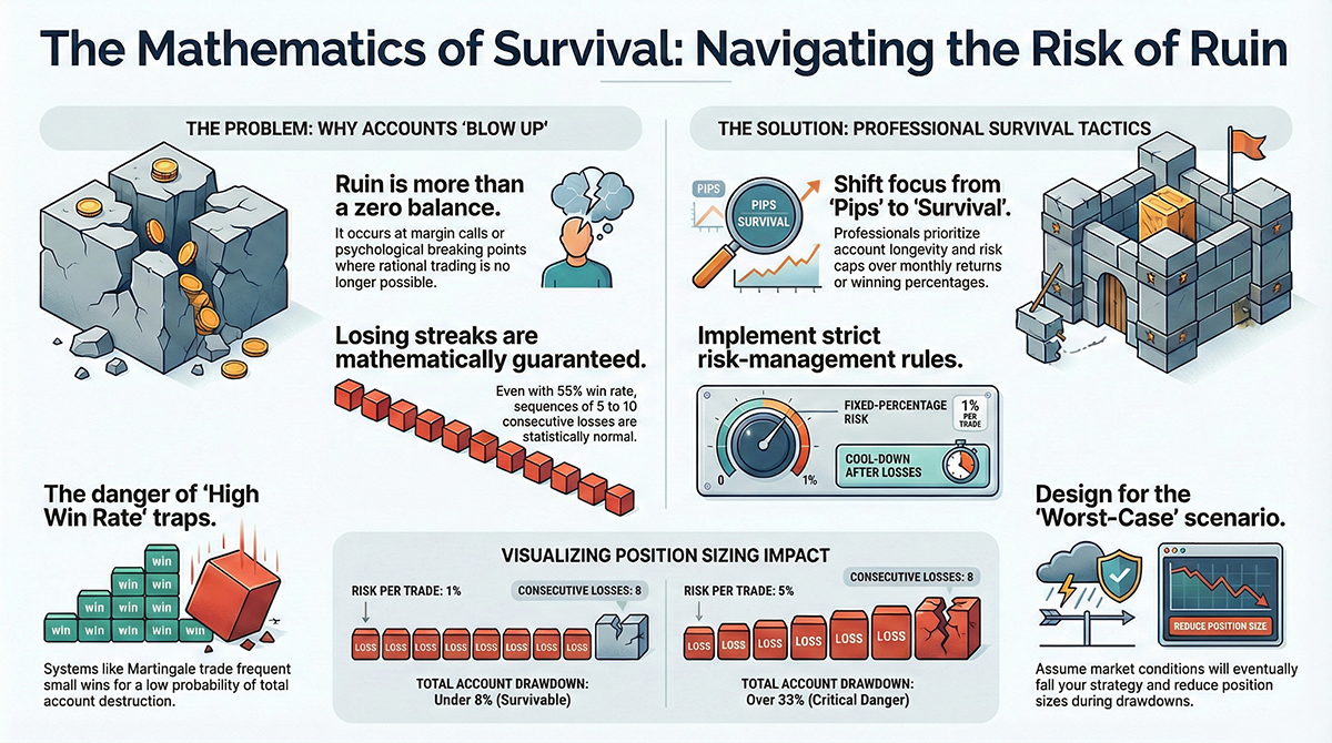 Risk of ruin explains why many traders and EAs fail over time. Learn how probability, account survival, and loss streaks determine whether your trading system lives or dies.