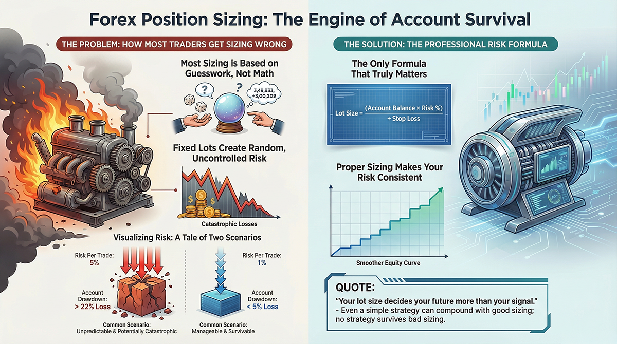 Position sizing is the true core of profitable forex and EA trading. Learn how lot calculation, account risk, and trade sizing determine long-term performance more than any entry strategy.