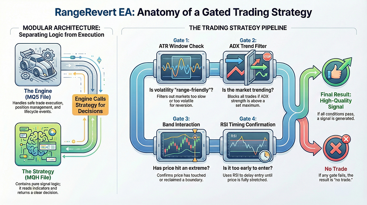 A developer-friendly breakdown of the RangeRevert MT5 EA: what it is, how the MQ5 engine and MQH strategy module work, key inputs, and a real .set example you can copy and tune.