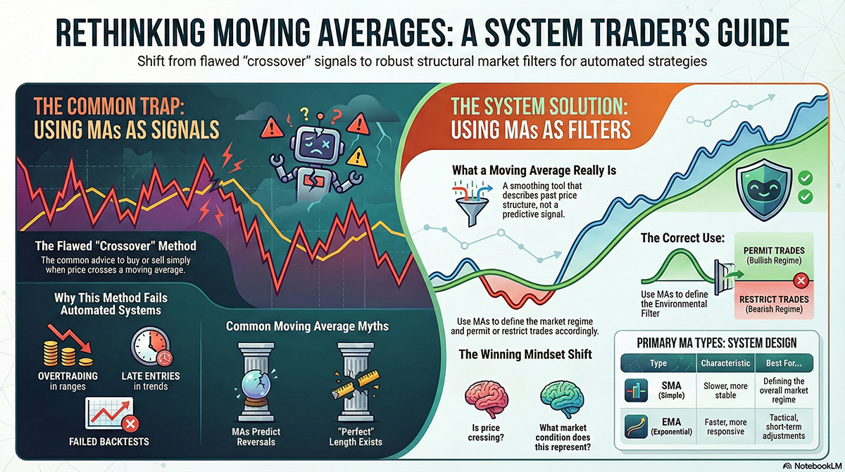 A system trader’s guide to moving averages. Learn how SMA and EMA really work, why they lag, and how to use them correctly for EA trend filtering and performance.
