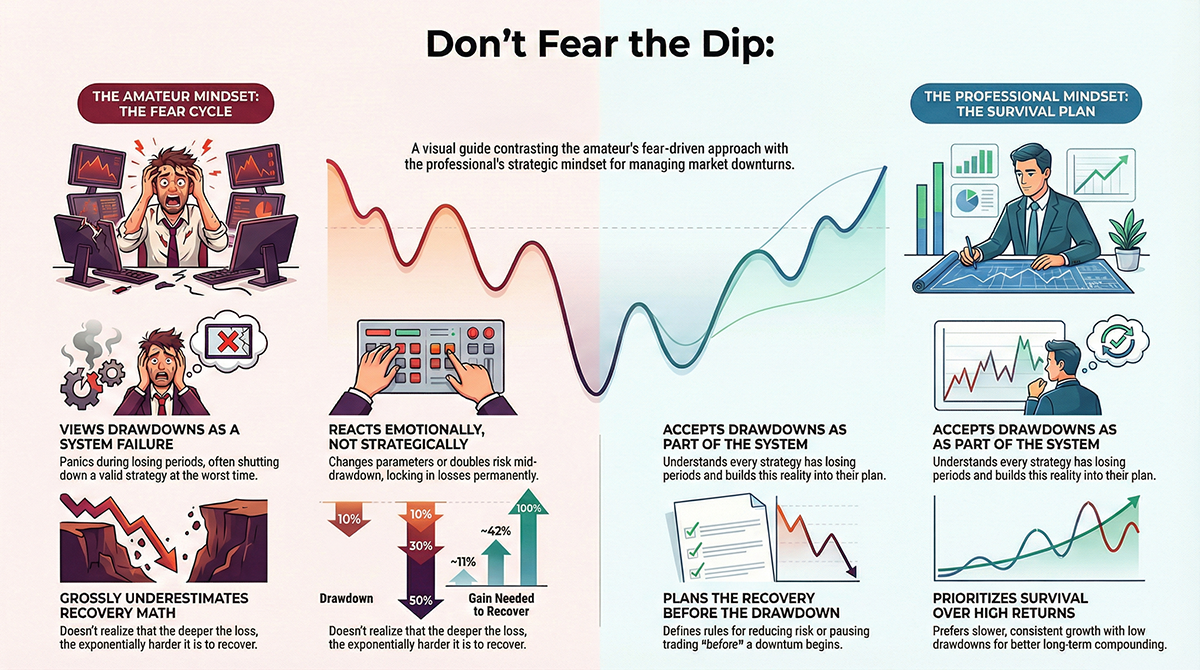 Drawdown management is the difference between surviving and quitting. Learn how professional and EA traders think about equity curves, risk tolerance, and recovery strategies.
