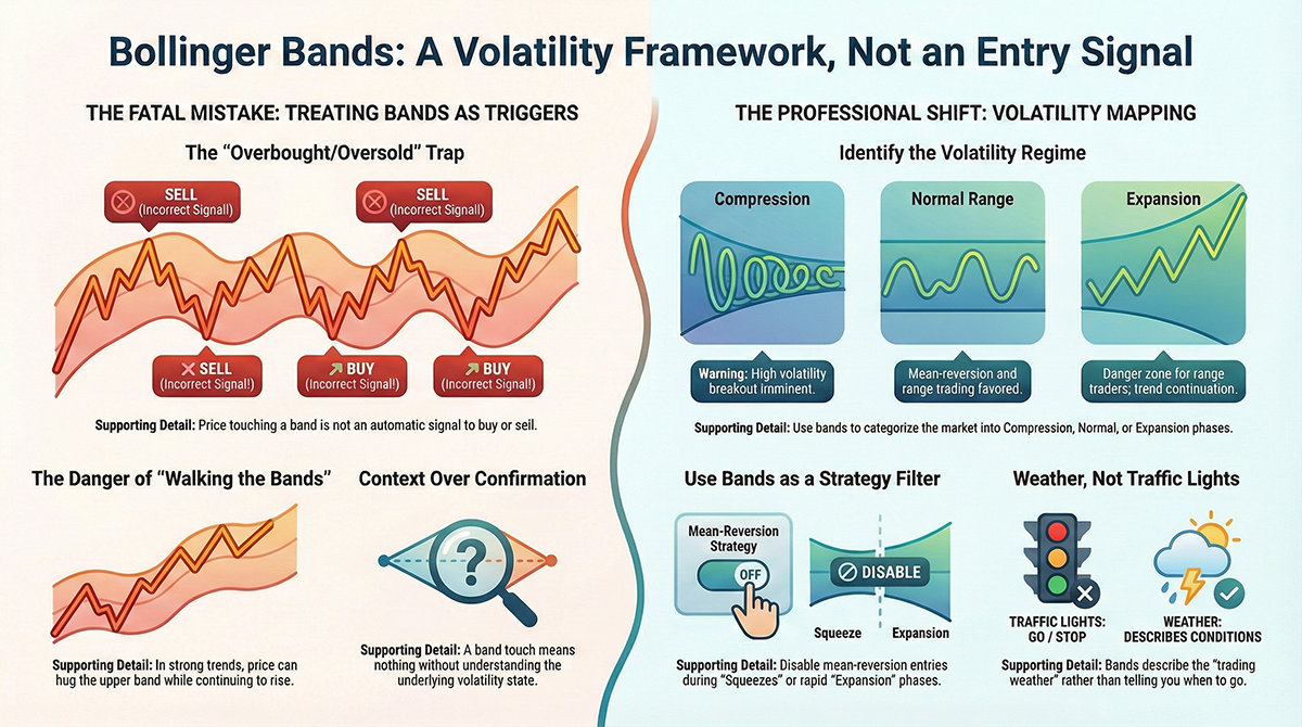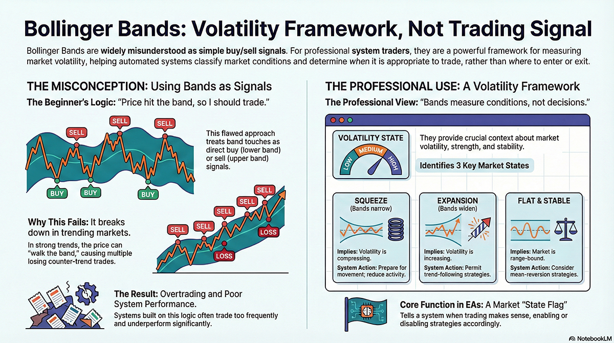 Bollinger Bands are widely misunderstood as buy/sell signals. Learn how professional traders and EA developers use Bollinger Bands correctly as a volatility and market regime tool for range detection, squeezes, and expansion phases.