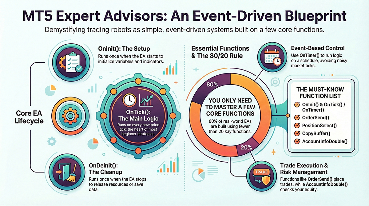 Learn all predefined methods used in MT5 Expert Advisors. This beginner-friendly guide explains OnInit, OnTick, OnTrade, indicators, trading functions, and which ones actually matter when building real EAs.