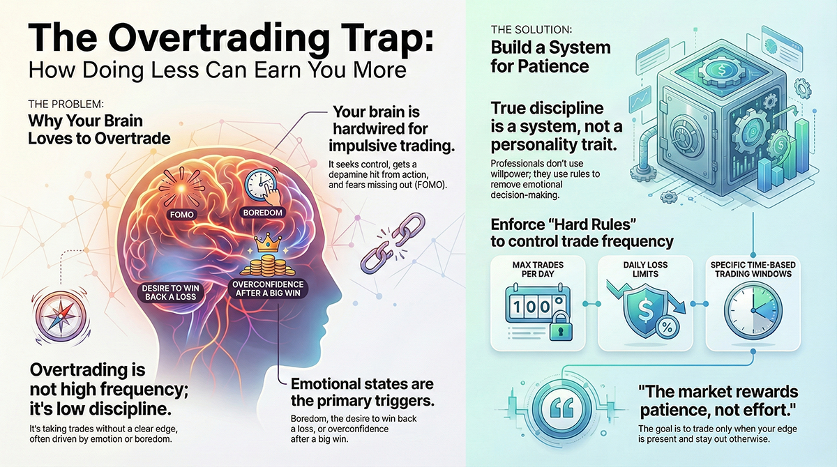 Overtrading is one of the fastest ways to destroy a trading account. Learn the psychology behind overtrading, why traders and EAs fall into it, and how discipline and structure stop it.