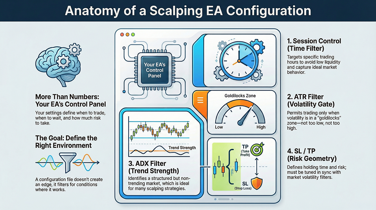Learn how to adjust a MetaTrader EA .set file for a scalping strategy. This guide explains ADX, ATR, filters, risk controls, and why systematic backtesting is essential for maximizing EA performance.
